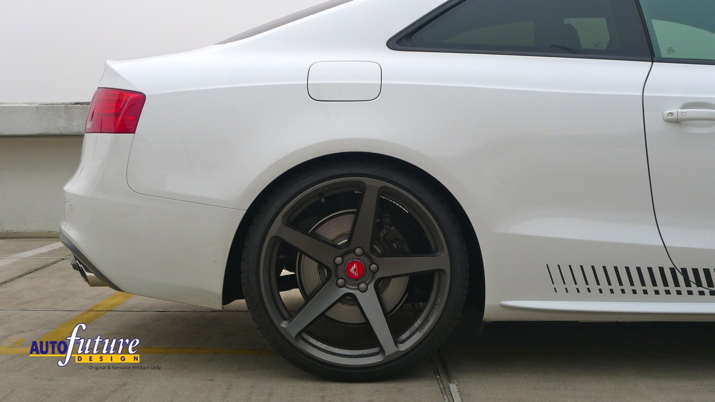 Lastly of course, are the wheels of the car. We swapped out his stock of 19″ S5 wheels with a set of Vorsteiner V-FF 104‘s measured at 10J x 20″ at all four corners. The application of the V-FF 104 wheels, ensures that this car in this set up remains unique and one of a kind. Reason being that, the compatibility of V-FF 104’s are limited and only applicable for certain models from Audi, Mercedes and Porsche. In its Carbon Graphite finish, it contrasts with the cars body colour and definitely exudes a sportier character. Speaking of sporty, we threw in a set of Vorsteiner Limited Edition Red Centre Caps to enhance the sporty character of the car. Wrapping up those wheels were a set of Toyo T1 Sport tyres at all four corners, ensuring that levels of control and handling remain at their highest.
