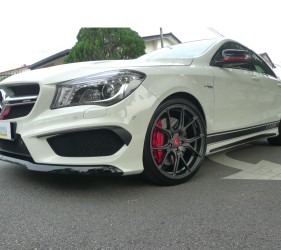 Our suggestion was to fit a set of Vorsteiner V-FF 103 wheels with their measurements at 8.5J x 19″ at all four corners. The wheels boast Vorsteiner’s Flow-Forged construction technology ensuring that the wheels remain super-light at 9.89kg. These super-light aluminium alloy wheels weighing at 9.89kg a piece in comparison to the stock rims that would easily outweigh these Vorsteiners, ensures that the overall weight of the car is kept to a minimum and that gives this car an additional performance edge over other stock CLA 45’s. Vorsteiner’s expertise with flow-forging technology ensures that durability is also not over looked, and to date we have received no complaints of dents or cracks on Vorsteiner manufactured wheels. For that extra level of detail, we’ve fitted the Vorsteiner Limited Edition Red Centre Caps to further enhance the aggressive and menacing looks of this AMG.