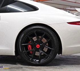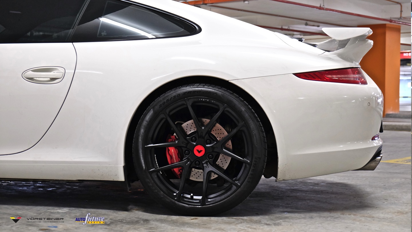 As such, keeping to our principles of delivering the best customer service possible, we arranged the set of alloys to have it sprayed in to our client’s desired customized Satin Black finish and the end result was great! Soon after, we arranged a convenient time for our client to bring in his Porsche and began the installation of the wheels. With a Satin Black finish on the wheels, we threw in a set of Vorsteiner Designer Red Center Caps of which not only contrasts perfectly with the wheels but also matches up with the red brake calipers of the 911 and as a whole only makes the whole car and wheel combination ever more stunning! To top it all off, we even installed the wheels via a set of Vorsteiner Spline Lug Bolts for added detail that would make this Porsche even more eye-catching to the finest details.